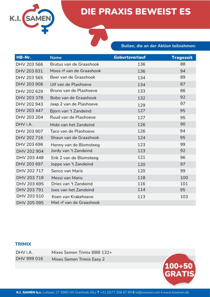 Die Aktion umfasst folgende Bullen:* Die Wahl aus dem effizientesten Zuchtprogramm der Niederlande für die WBB Gebrauchskreuzung bedeutet, sich für eine kürzere Tragezeit und einen leichten Kalbeverlauf zu entscheiden. Die Aktion umfasst folgende Bullen*: