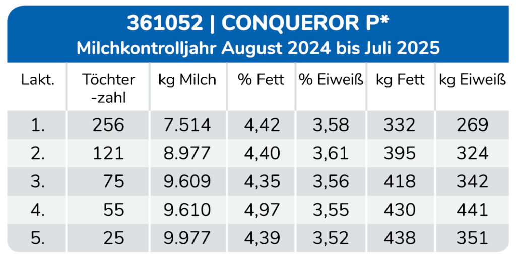 Dass die höchste Produktion oft nach der vierten Laktation erreicht wird, zeigt sich auf der tatsächlich realisierten 305 Tage Liste der Conqueror P Töchter. *niederländische Zuchtwerte.